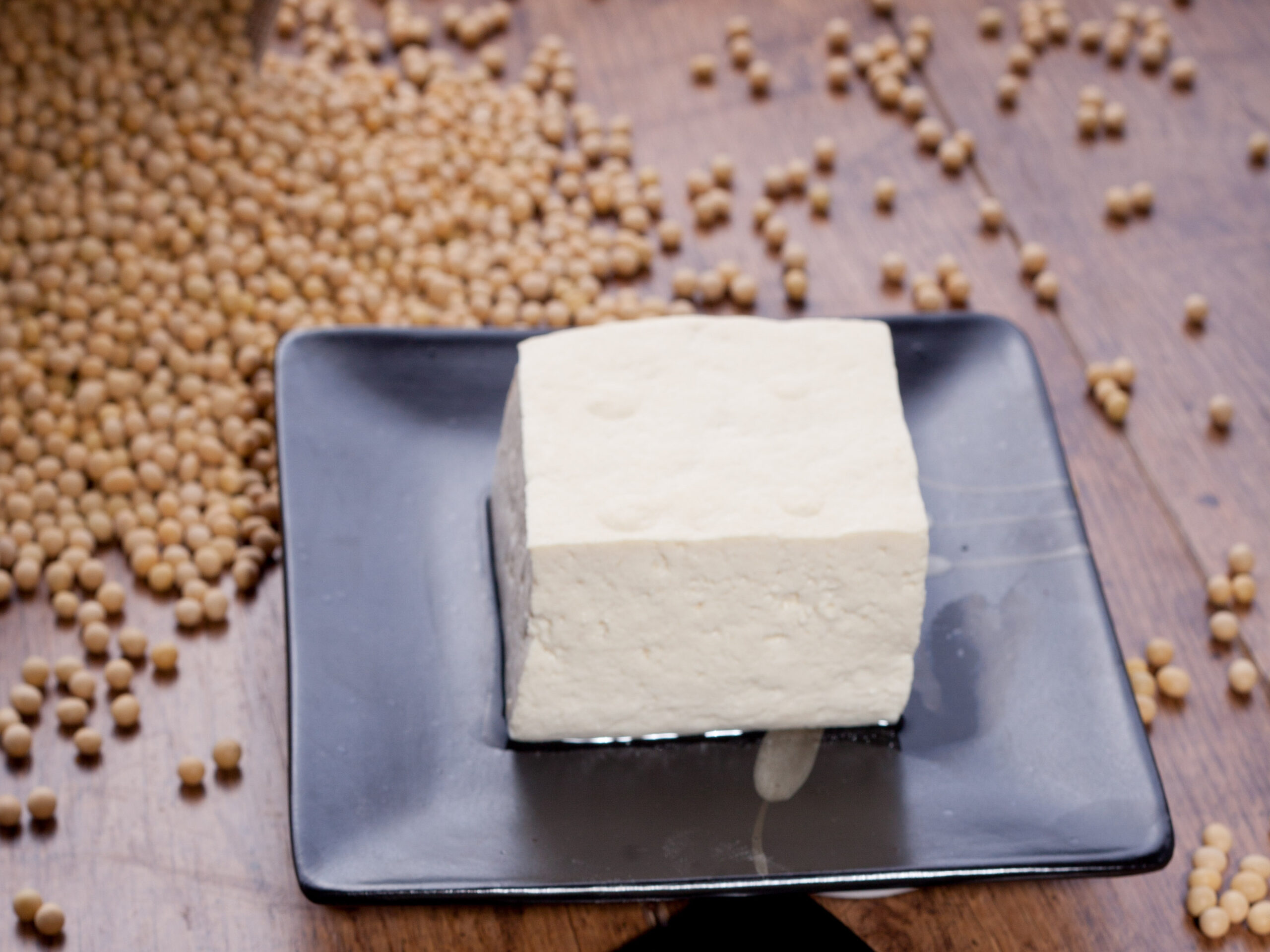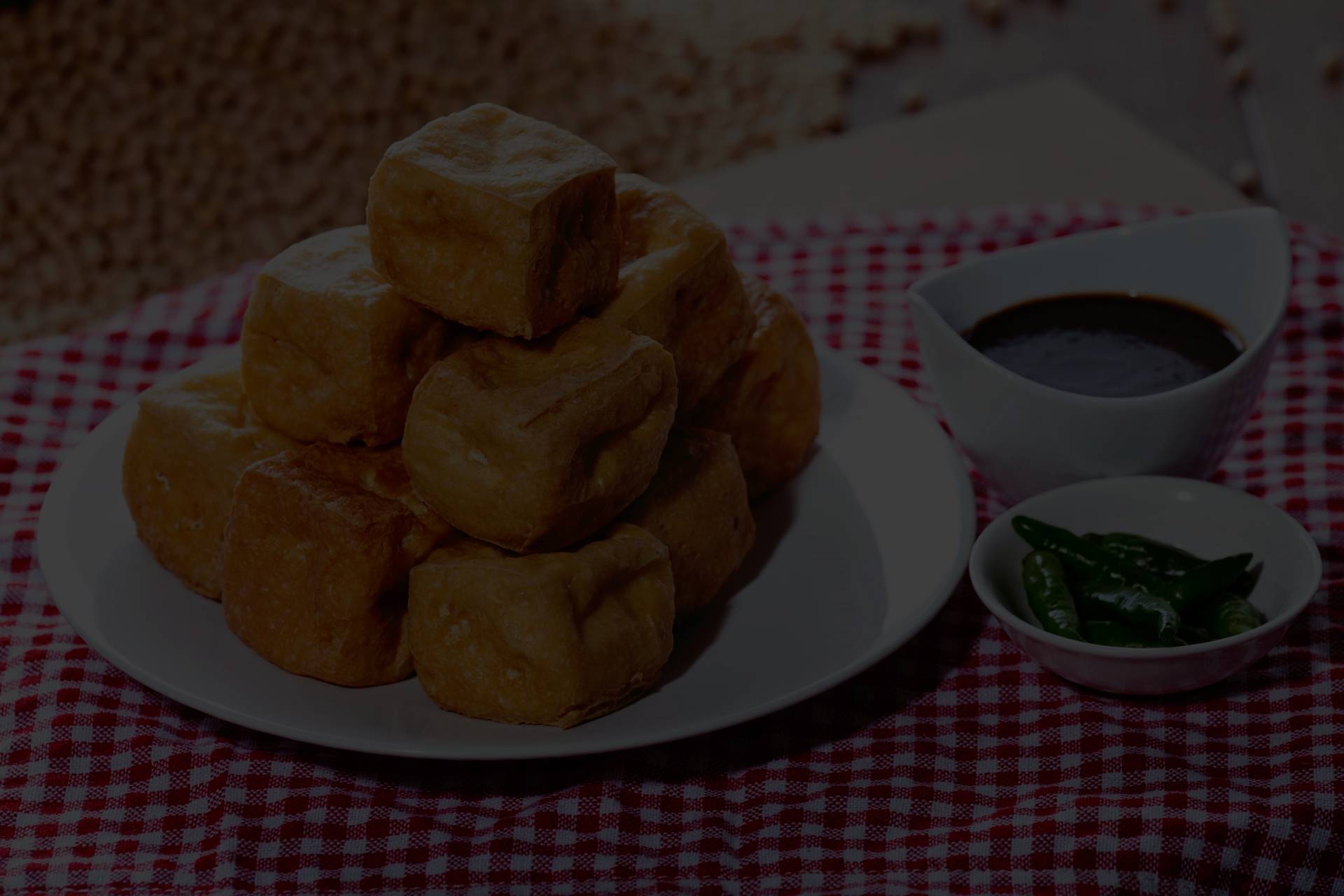 Sliced fried tofu with soy sauce.