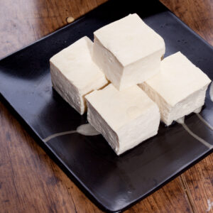 Sliced fried tofu with soy sauce.