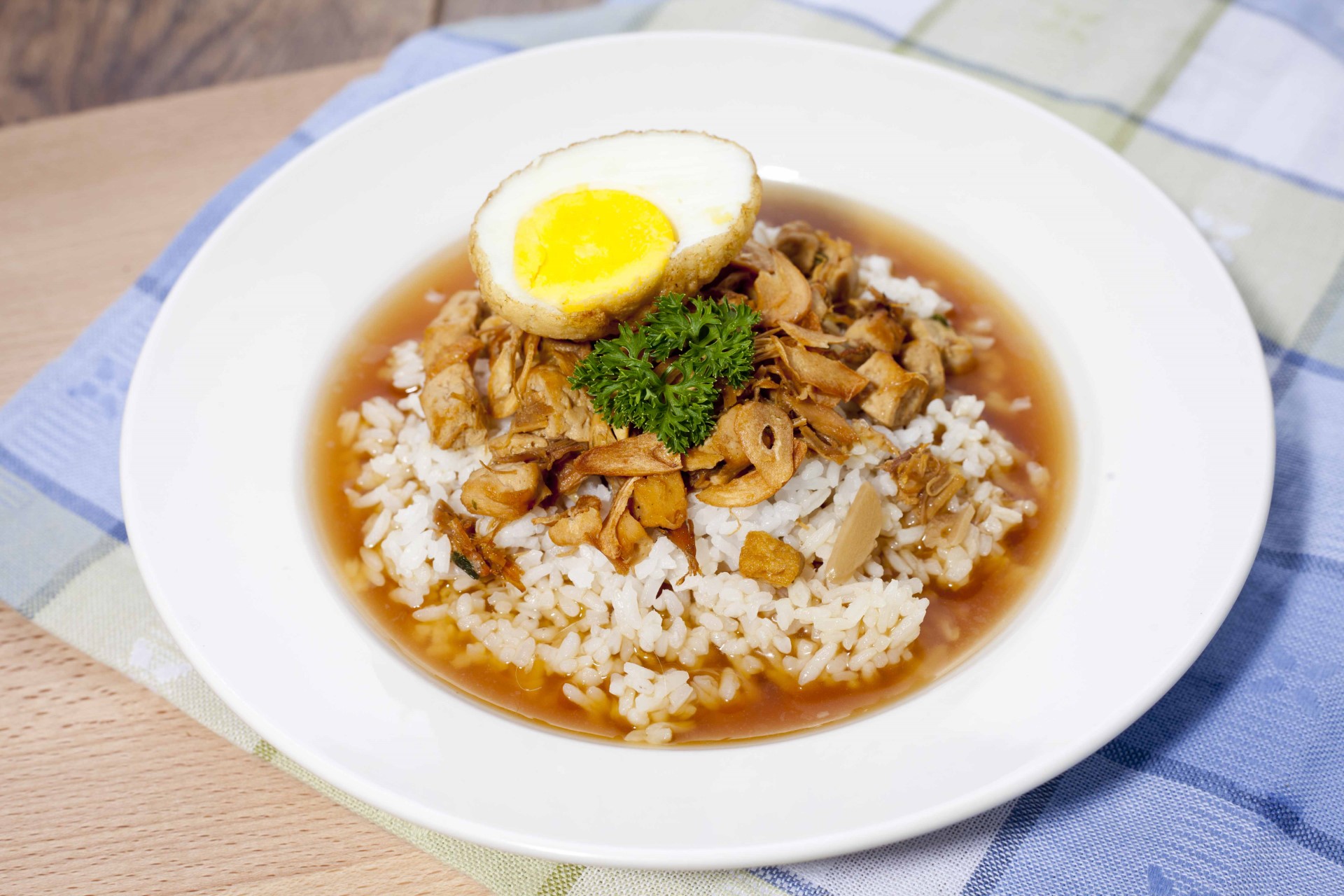 Steamed rice cover with chicken, shrimp meat balls, coocked with herb soy sauce adn half egg